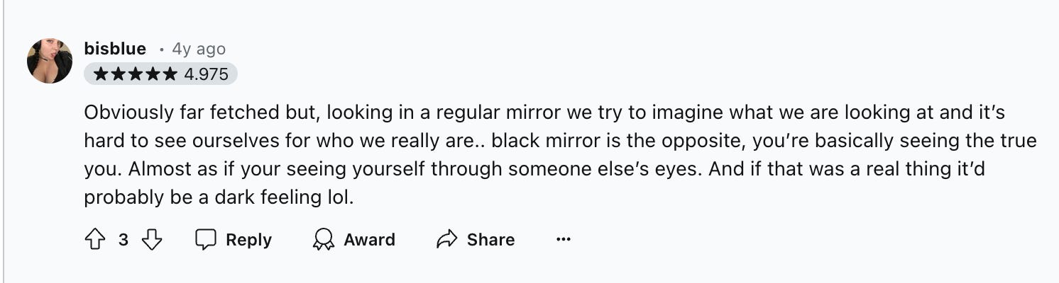 You are probably familiar with the popular dystopian-technology sci-fi TV show Black Mirror. The show’s creator has previously said the title refers to our devices being black mirrors we carry everywhere, that once the screens boots down they reflect ourselves in them. Far out. The creator has spoken numerous times about the title, but I liked what this Reddit user had to say about their thoughts on the symbolism of what “black mirror” means.